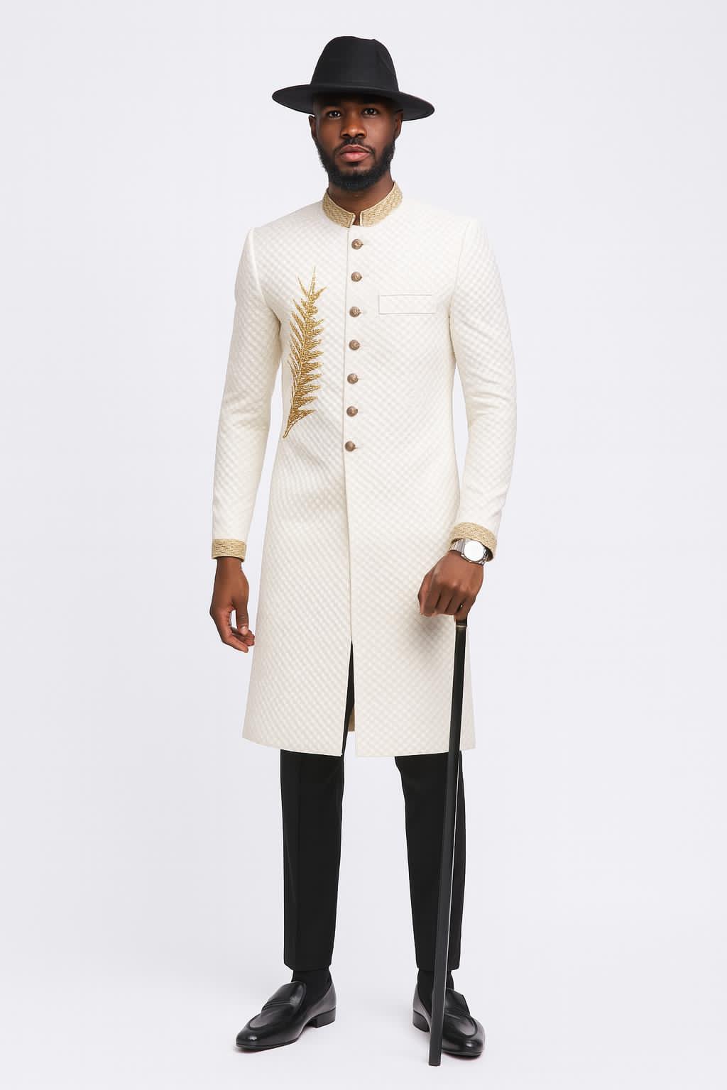 The Ivory Jacquard Long Suit exudes class, royalty and power. Our signature gold palm which depicts wealth is beaded onto this high fashion which fuses western and traditional silhouettes.