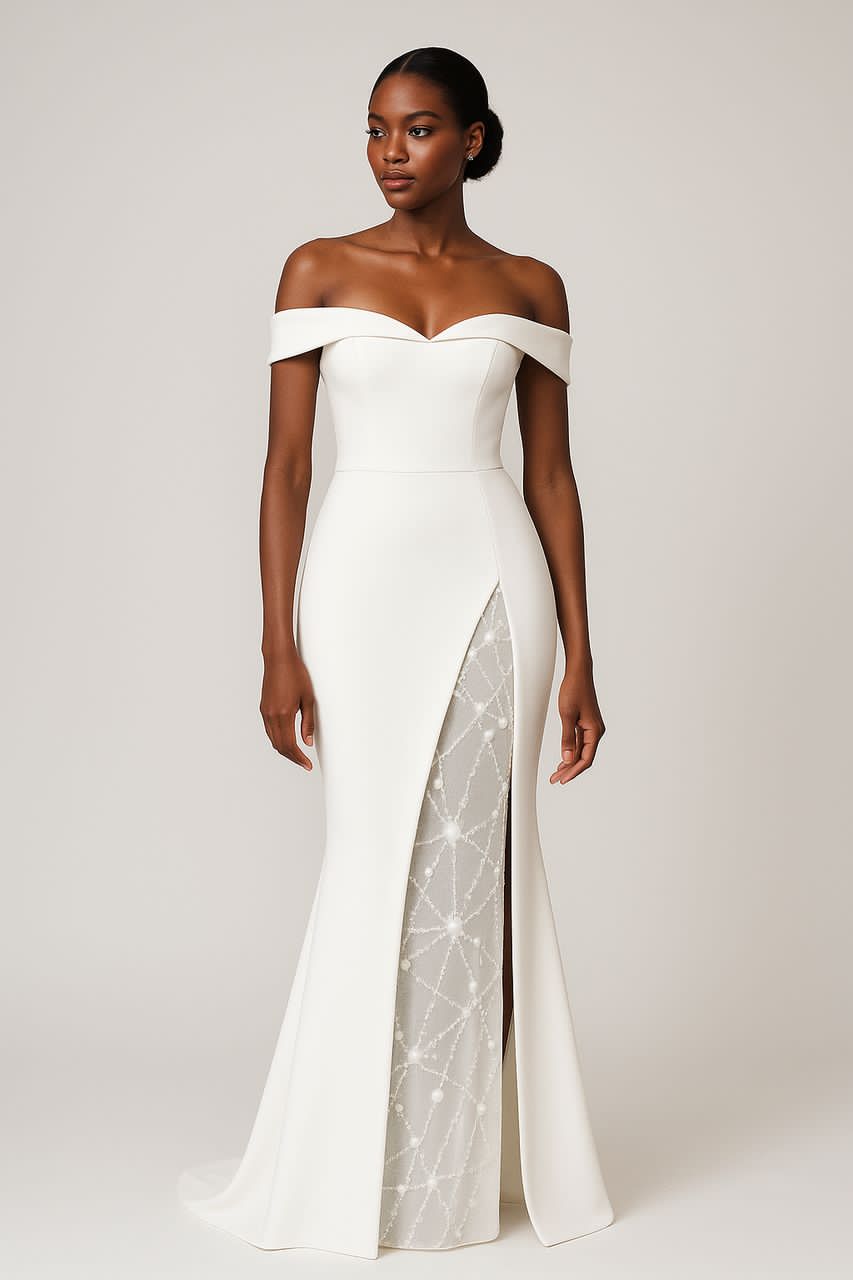 OFF-SHOULDER OPEN SLIT GOWN WITH INTRICATE SPIDER NET SKIRT