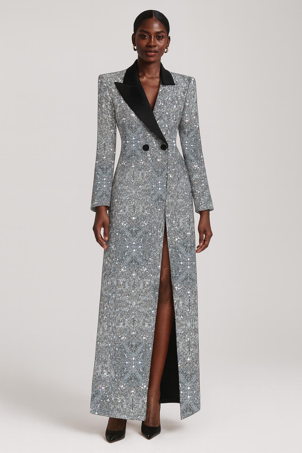 A fashion classic that exudes timeless glamour, the Silver Sequin Blazer Gown is the definition of corporate elegance and a must-have!
